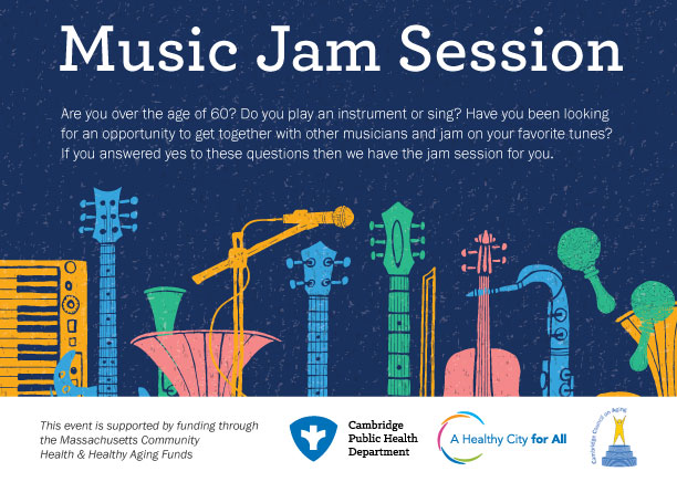 The Cambridge Senior Center and the Cambridge Public Health Department are presenting a music jam session series this spring on select Mondays beginning at 4:30 p.m. Saxophonist Bobby Tynes will once again host the sessions with his group of amazing musicians who will provide the rhythm section of your dreams. You will enjoy making music with these musicians. Their music inspires all to keep coming back for more! So, bring your voice, drumsticks, guitar, percussion, your horns, harmonicas and most importantly your love of playing music with others. No registration required to attend. Click to view the printable Music Jam Session flyer.